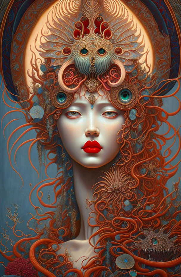 3D, Fresco of Medussa wide eyes, wild hair, red lips, By James Jean, Mark Ryden, Brian Froud, Zdzisław Beksinski, H. R. Giger, Hieronymus Bosch, extremely detailed, high definition, crisp quality, unions