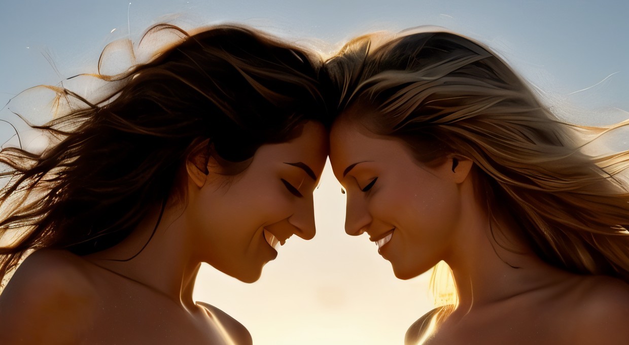 Two women face each other, their foreheads touching, with their hair flowing in the wind. A warm, golden backdrop enhances the intimate and joyful atmosphere of the moment.