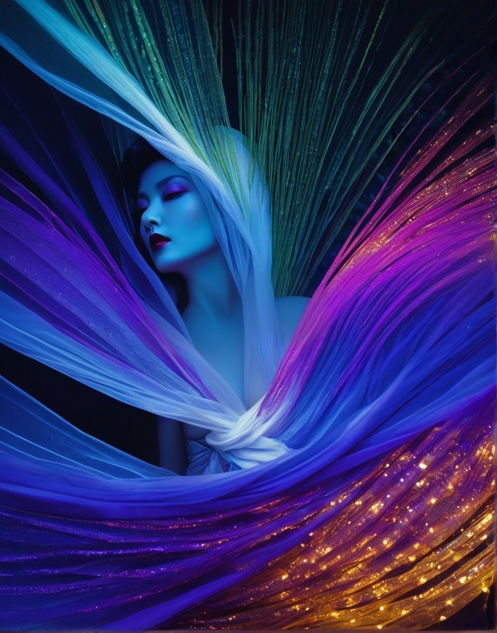 A woman is enveloped by a swirling, vibrant array of blue-to-purple fibers, creating a mesmerizing, peacock-like visual effect.