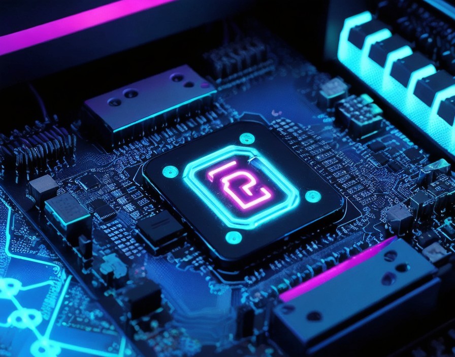 Prompt: "A glowing computer chip placed on a detailed and colorful circuit board. The chip and surrounding circuits are illuminated with vibrant lights, creating a technological and futuristic atmosphere. The chip is surrounded by complex circuits that glow in various colors - mainly in shades of blue and red"