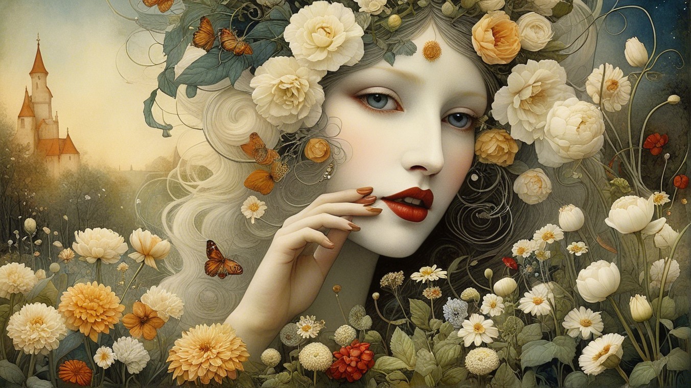 A serene woman with flowing hair adorned with flowers gazes softly, surrounded by vibrant greenery and blooming wildflowers, set against a dreamy landscape with distant castles.