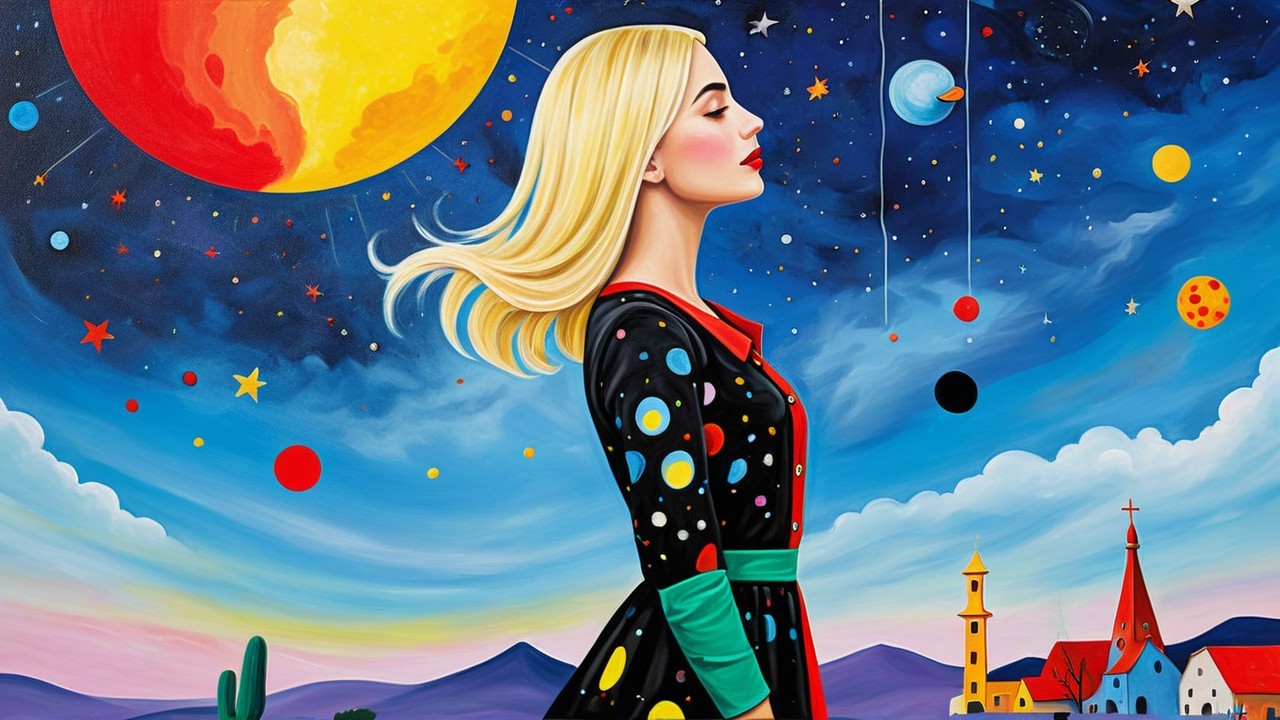 Prompt: (Masterpiece), Amelie Elmquist aka Amelea (20yo blonde full body) Vibrant colors blend in the sky, featuring celestial bodies and a dreamlike atmosphere.", Side view, Abstract expressionism, Maximum surrealism, Pop art)), Inspired by the style of Wassily Kandinsky and Amelie Elmquist aka Amelea herself