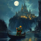 A whimsical scene features a fox in a boat, gazing at a majestic castle under a full moon. Lush mountains surround a serene lake, creating a magical atmosphere.