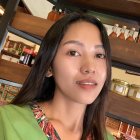 A woman with long, dark hair smiles brightly while holding a glass of coffee in a cozy café. The background features shelves with jars and a coffee machine, creating a warm, inviting atmosphere.