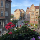 A picturesque street scene features elegant buildings adorned with vibrant flowers on balconies. A woman walks leisurely along the tree-lined road under a bright, clear sky.