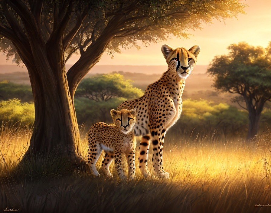 A cheetah and its cub stand under a tree amid the golden light of a savannah sunset, surrounded by tall grass and distant trees in the style of Colin Bogle.