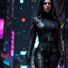 A full body shot of a woman with black hair in a black leather outfit consisting of a cropped jacket, pants, and fingerless gloves. Her skin is pale, with dark eye makeup and a crimson lower lip. She has light purple on the left side of her hair. a