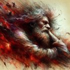 The image features a man with unkempt hair and a beard, lost in thought. His expression conveys deep emotion against a backdrop of swirling colors and chaos, hinting at a story of struggle.