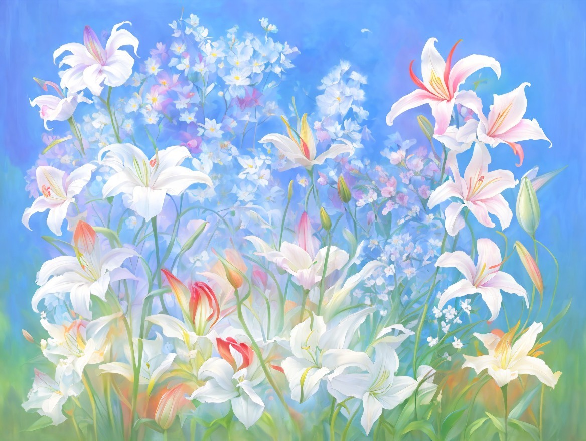 + Prompt:a painting of a bunch of colorful flowers, a digital painting, inspired by Franz Marc, psychedelic art, exotic lily ears, stunning beauty, glass flowers, colorful with red hues, air brush art, vibrant realistic colors, large opaque blossoms, vibrant color details, intricate flowing paint, morning glow, amazing depth, muted but vibrant colors, splashes of colors