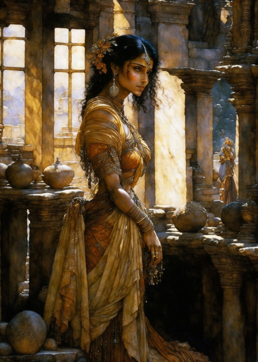 A woman in a vintage dress stands by a stone balcony, looking thoughtfully into the distance, with a cityscape background.