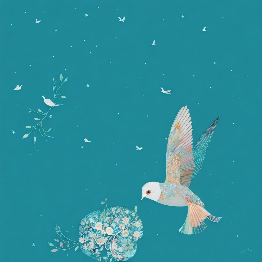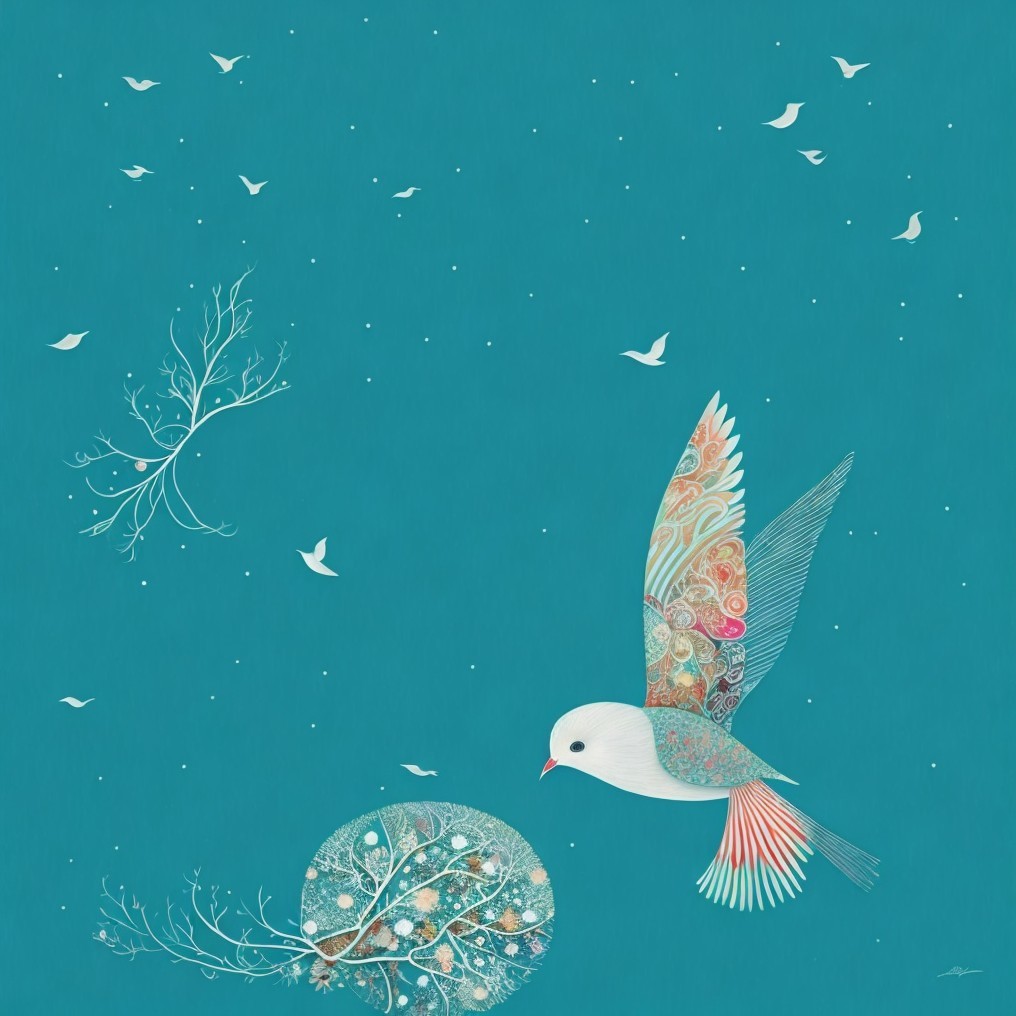 Colorful Bird Flying Over Floral Orb with Doves on Teal Background