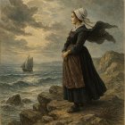 Prompt: A romantic 19th-century Breton coastal scene. A Breton woman stands on a rugged, windswept rocky promontory, gazing out to sea as she waits for a boat. She wears a traditional dark dress, embroidered apron, and lace coiffe, her shawl fluttering in the sea breeze. The Atlantic sky is dramatic and luminous, with soft golden light breaking through gray clouds, casting shimmering reflections on the restless sea. In the distance, a small fishing boat approaches through mist and surf — its shadow stretches faintly across the water toward the waiting woman. The atmosphere is emotional, nostalgic, and filled with longing, painted in the romantic 19th-century style with fine textures, soft light, and expressive brushwork capturing both the grandeur of nature and the quiet dignity of the figure.
