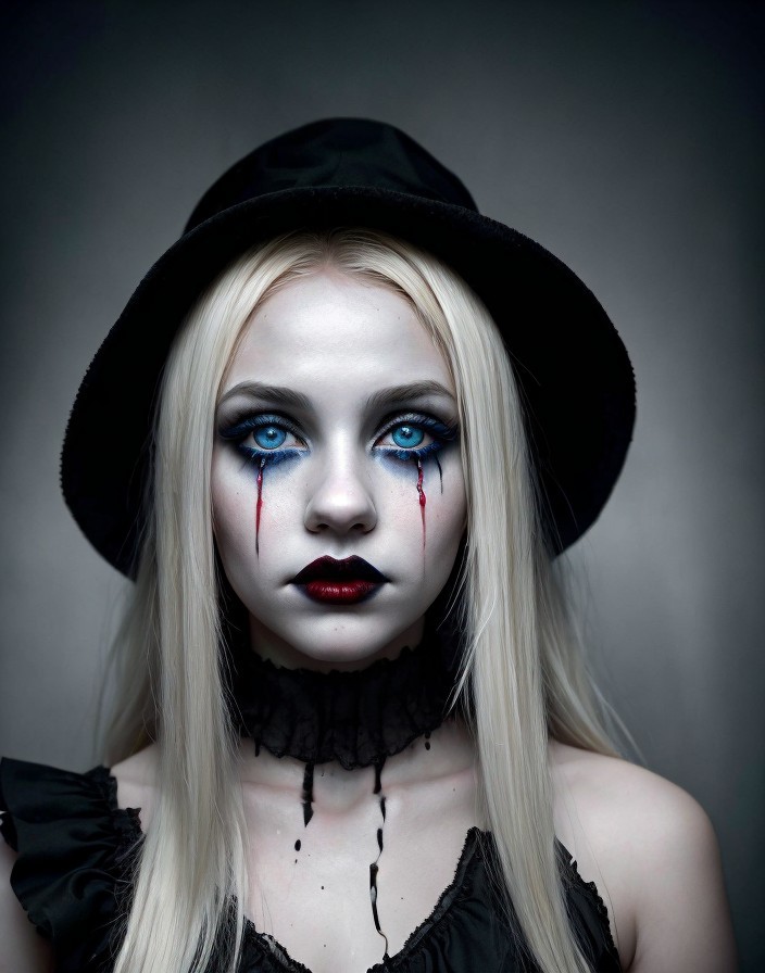 A haunting portrait of a pale young woman with striking blue eyes and dark makeup, featuring tears of black and red that trickle down her face, all framed by a wide-brimmed black hat.