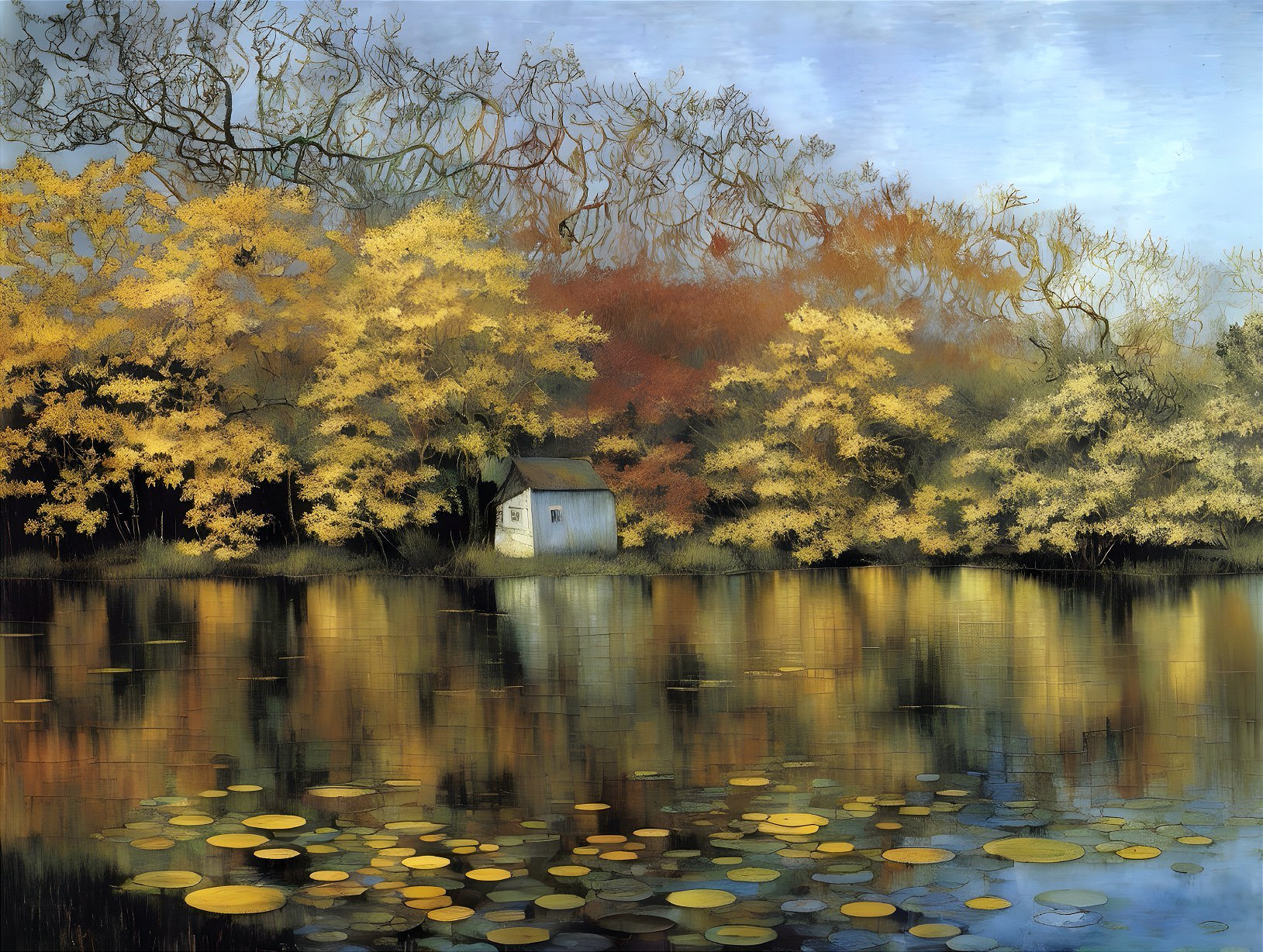 A tranquil autumn scene with a small white house by a tree-lined lake reflecting vibrant fall colors, complete with floating water lilies.