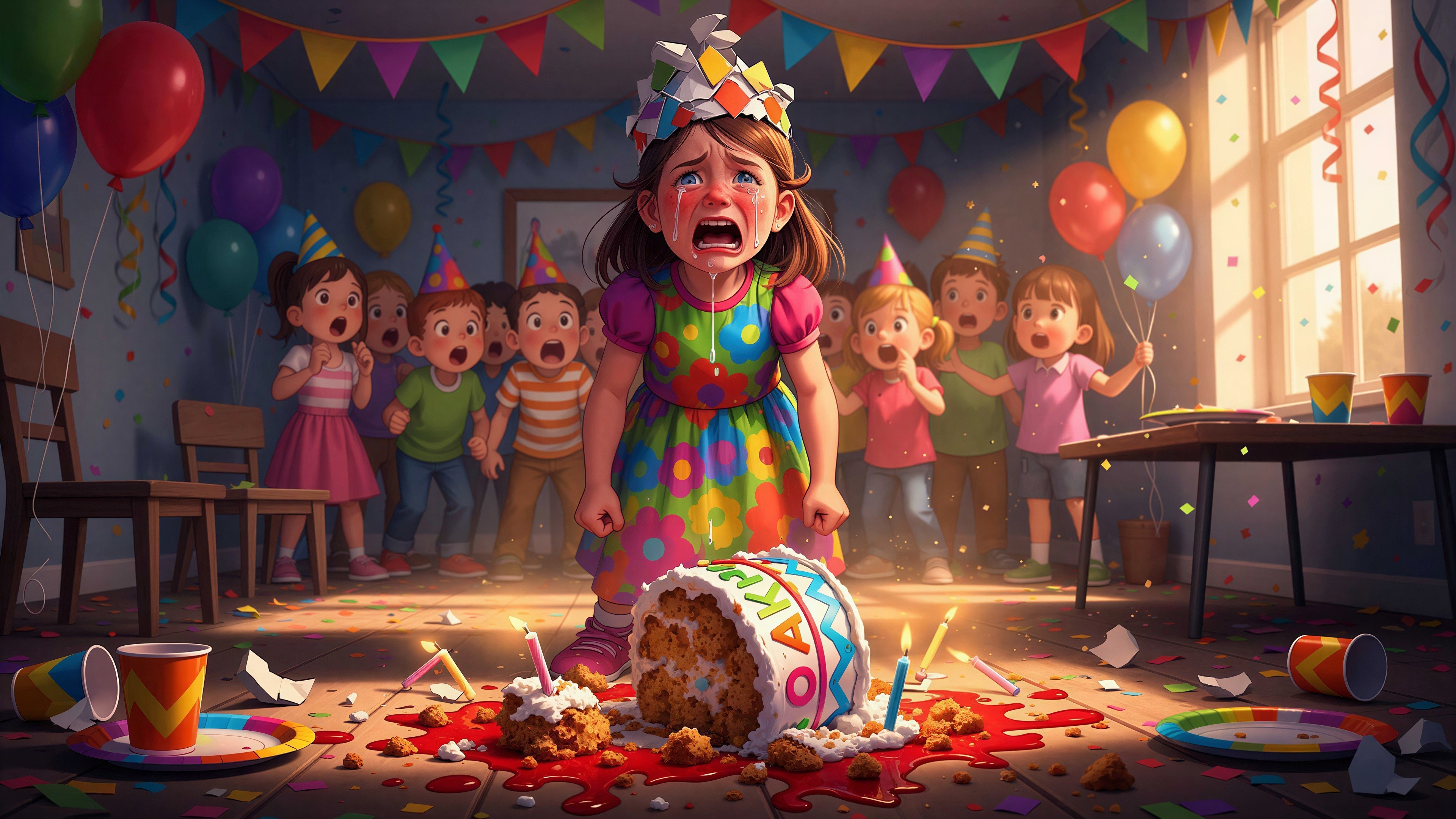 Create a scene of drama and angst. A little girl is crying so hard because her birthday party has been ruined. [ Her birthday cake is laying ( UPSIDE-DOWN ) on the floor and has splattered. ] All her friends look so shocked.
