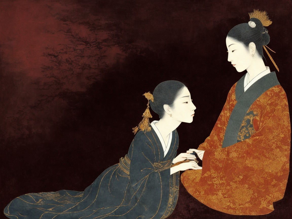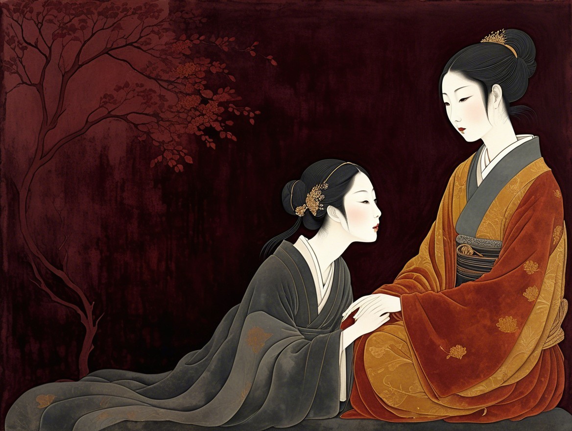 The artwork depicts two elegant figures in traditional kimonos against a deep red background, with delicate cherry blossoms. One woman reaches out to the other, capturing a moment of connection.