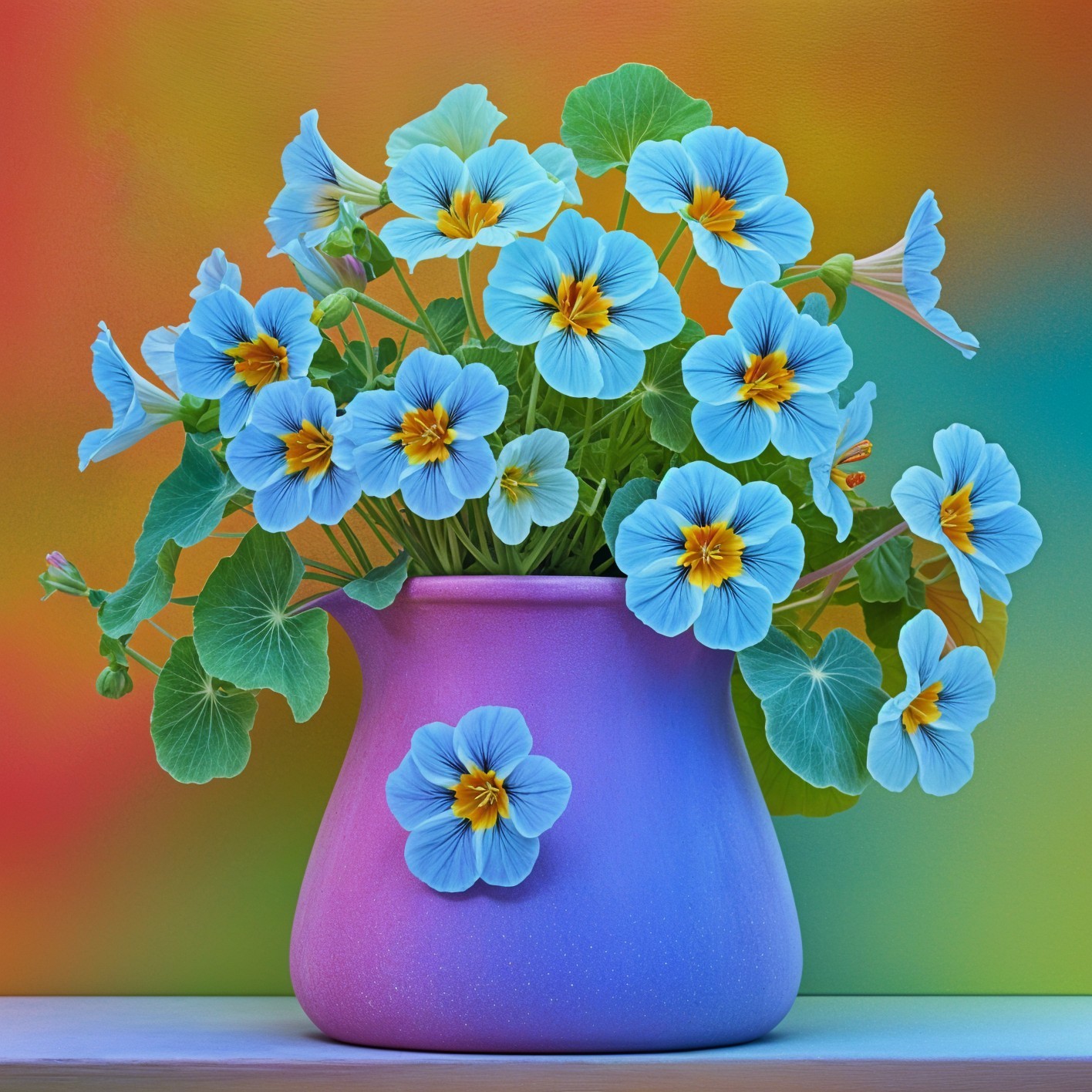 A vibrant arrangement of pastel-colored flowers in a glossy purple vase, set against a colorful, gradient background, creating a cheerful and lively atmosphere.