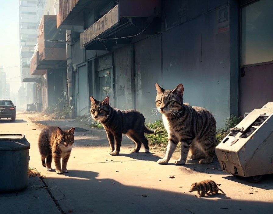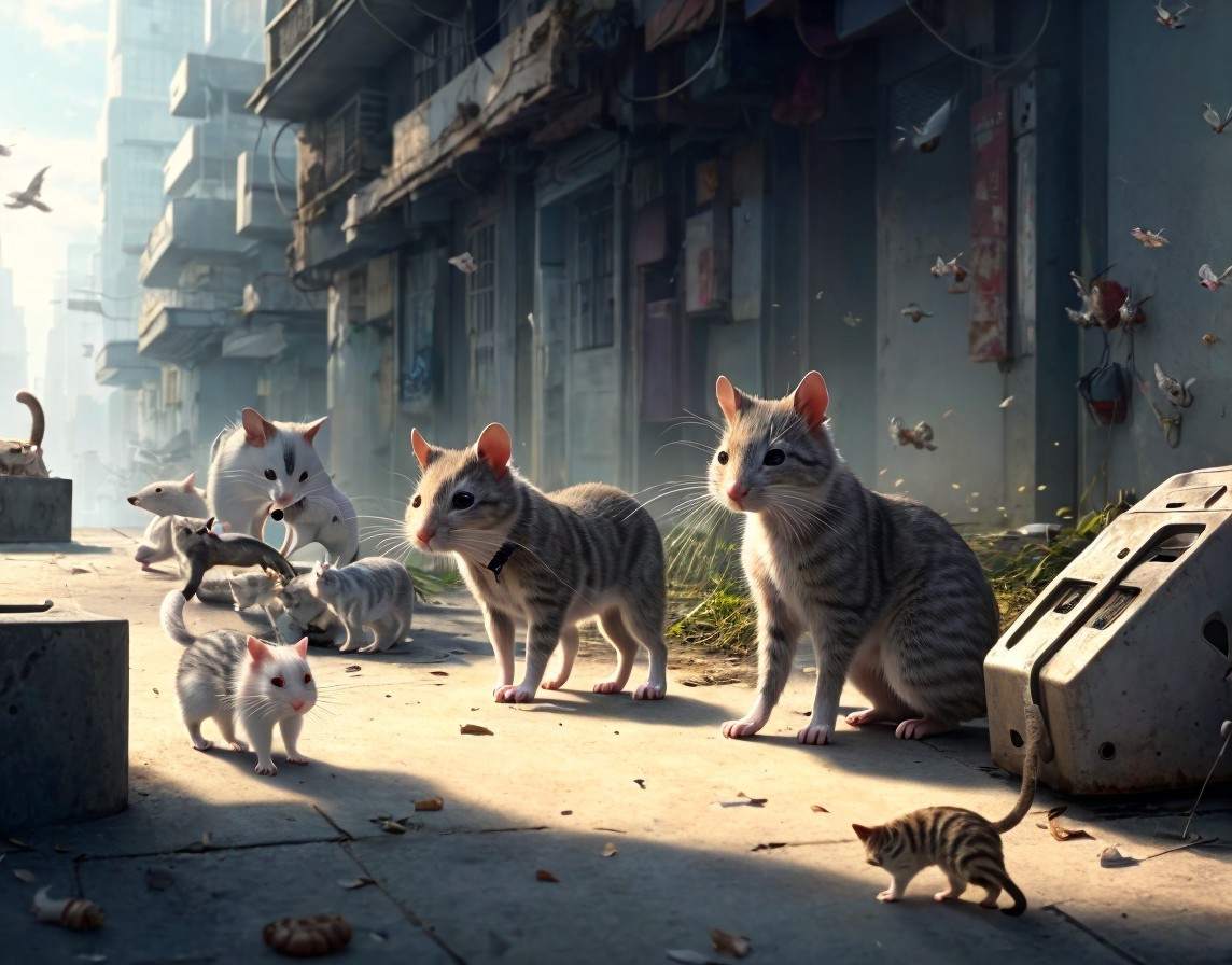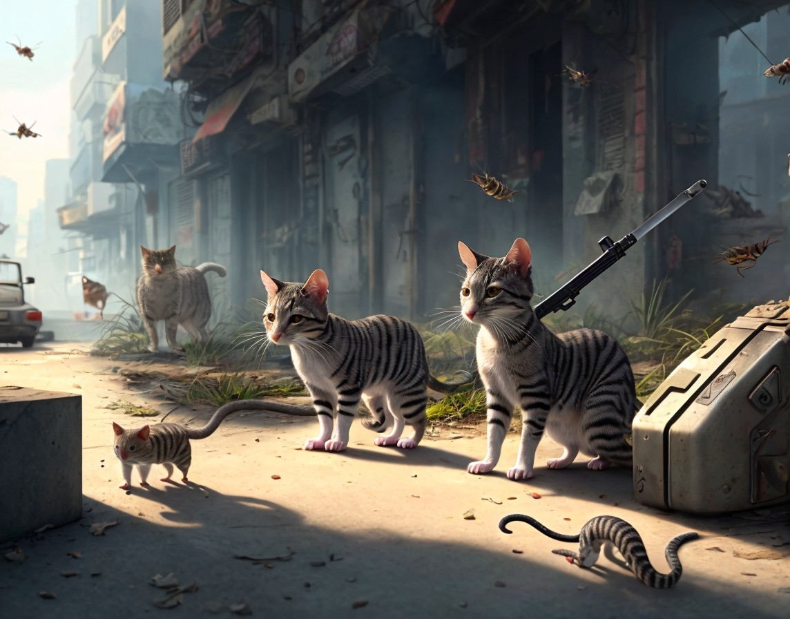 Two ratcats with stripes resembling a zebra protects the little one in the itter. In a strange tomorrow.