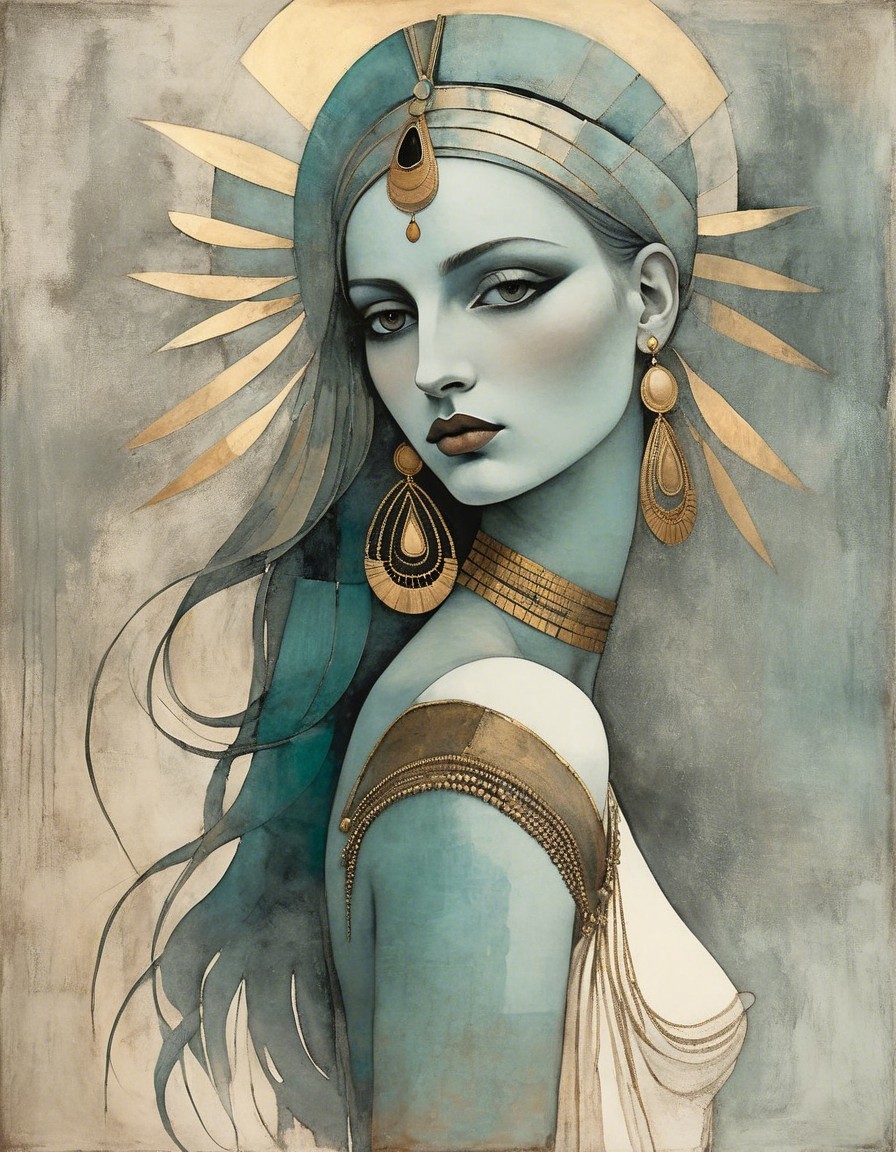 Queen of the Nile. foggy nostalgia, portrait in Burnt umber and soft teal, salmon gold, smoke and mirrors, patina of, battery acid, art brut, moody, somber, desaturated colors, in the style of Paul Klee, Arthur Rackham Dark and moody oil painting of a woman with piercing black eyes, inspired by the works of John Singer Sargent and Edgar Degas, long shot, realistic texture, dramatic lighting, intricate details on clothing and Magical woman fading tones of melancholy and summer nostalgia, soulful portrait, in burnt umber, plutonium, patina of mercury glass, tea stains, art brut, moody, somber, desaturated colors, in the style of Paul Klee, Banksy, Arthur Rackham, based on Prompt by KRW