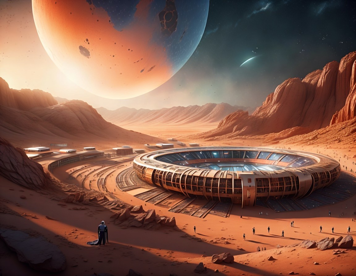 An oasis with a circular pool in a desert landscape, surrounded by rock formations, under a clear sunny sky.