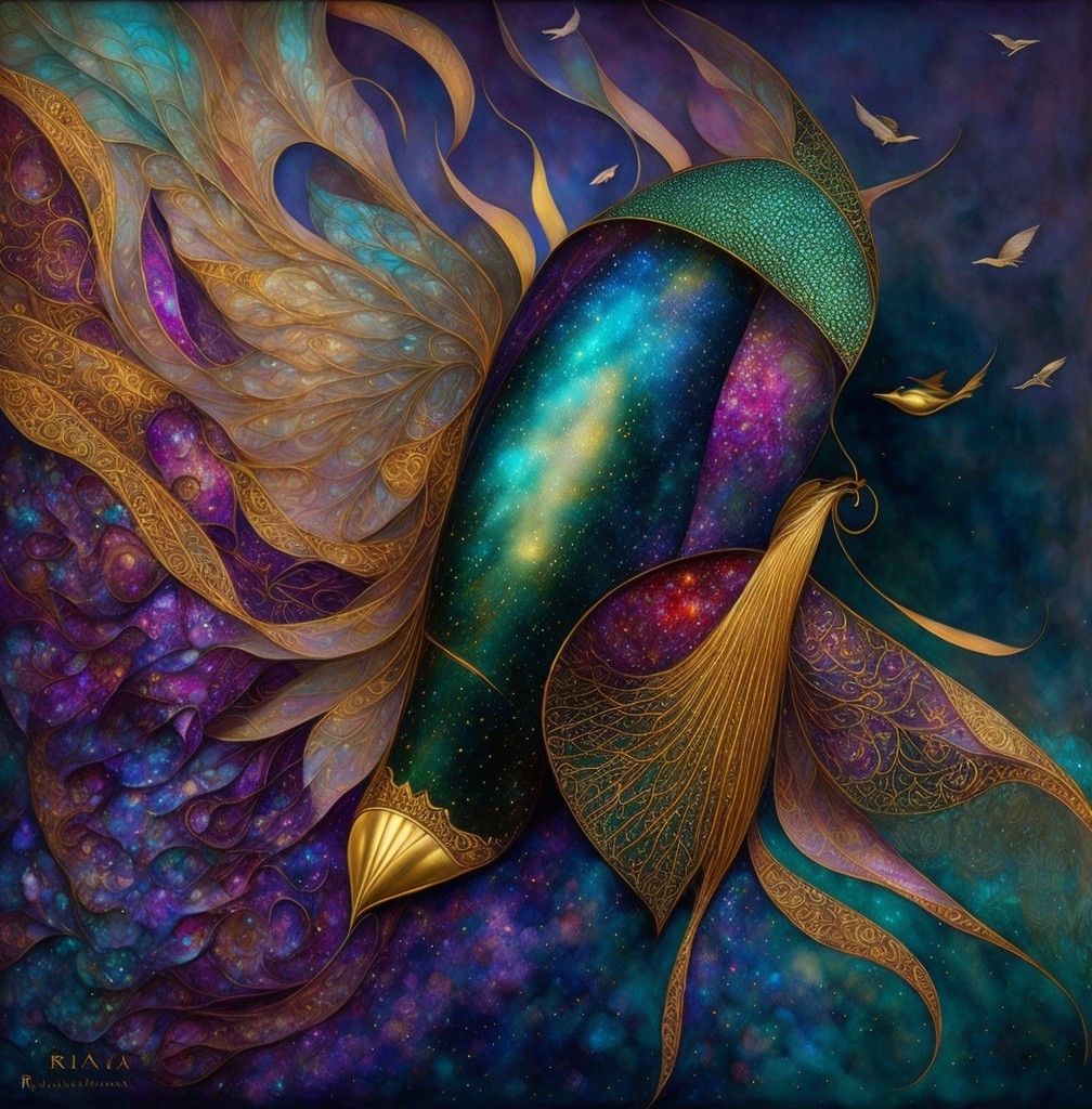 A woman in profile wears an elaborate headdress adorned with vibrant feathers and jewels, set against a night sky. Her serene expression contrasts beautifully with the colorful backdrop.