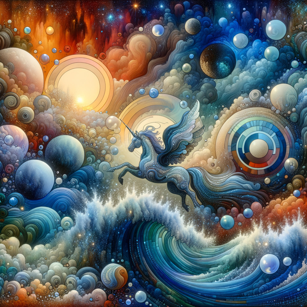 A vibrant seascape features turbulent waves crashing against rocky cliffs, with a small sailboat navigating the waters under a colorful sunset, creating a sense of adventure and tranquility.