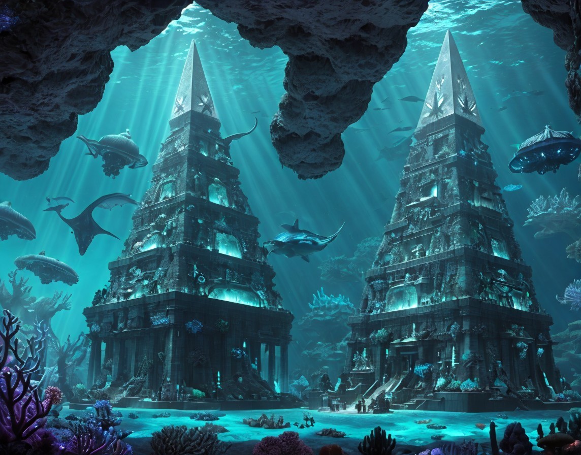 + Prompt:Underwater Extraterrestrial bioluminescent menagerie pyramid intertwined with advanced alien technology in a deep-sea aquatic landscape full of marine life with deep ravines and a bioluminescent coral reef, giant manta rays, statue of poseidon, mushrooms, large jagged crystals and cthulu like sea monster with long tentacles. Pyramid surrounded by colossal crystals. UFO in front of 3D-rendered bioluminescent mushrooms and colossal crystals. sacred geometry, mystical occult imagery (hamsa, eye of providence), talismans, esoteric tarot cards, and the all-seeing eye. Realistic and natural elements, under a cosmic sky. alien plants, psychedelic elements like galactic DMT entities, hallucinogenic vibes, shamanic horror LSD art, and the ethereal DMT realm. In the style of Cameron Gray