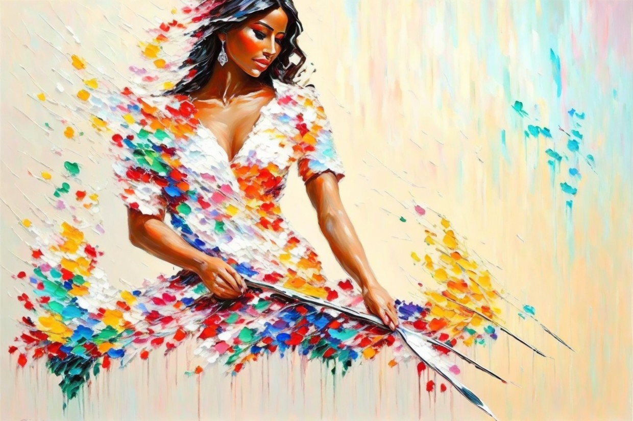 A vibrant painting of a woman adorned with blooming roses, draped in floral colors. Her graceful pose and the bright, abstract background evoke a sense of beauty and harmony.