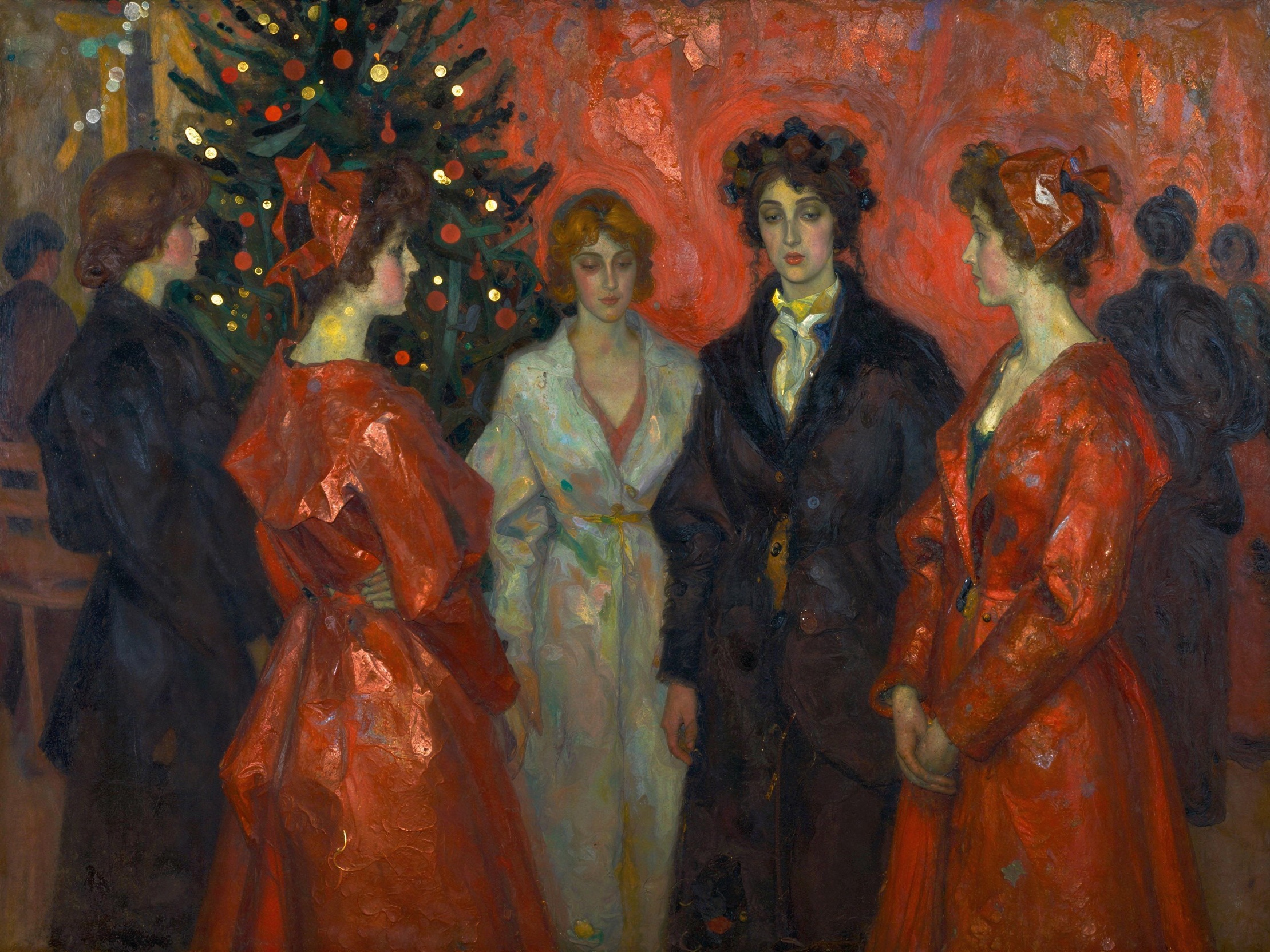 A richly textured painting entitled "The Christmas Tree" by Rupert Bunny depicts five young women gathered around a lit Christmas tree in a warm interior, with two additional blurred male figures in the background. The painting is executed in an impressionistic style with visible brushwork, especially noticeable in the vibrant red wall behind
