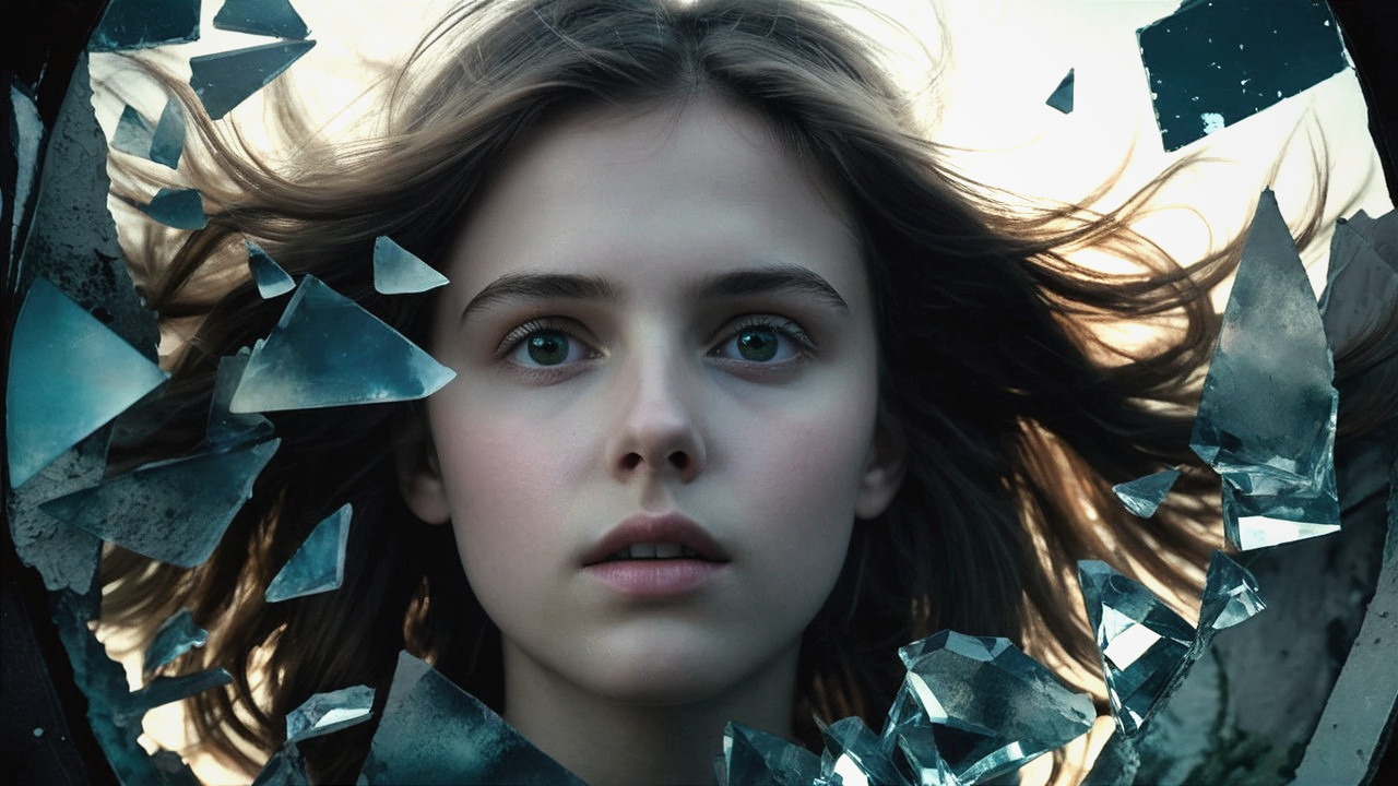 A young woman gazes contemplatively, framed by shards of broken glass that reflect light. Her hair flows around her, adding a sense of movement and mystery to the serene expression on her face.