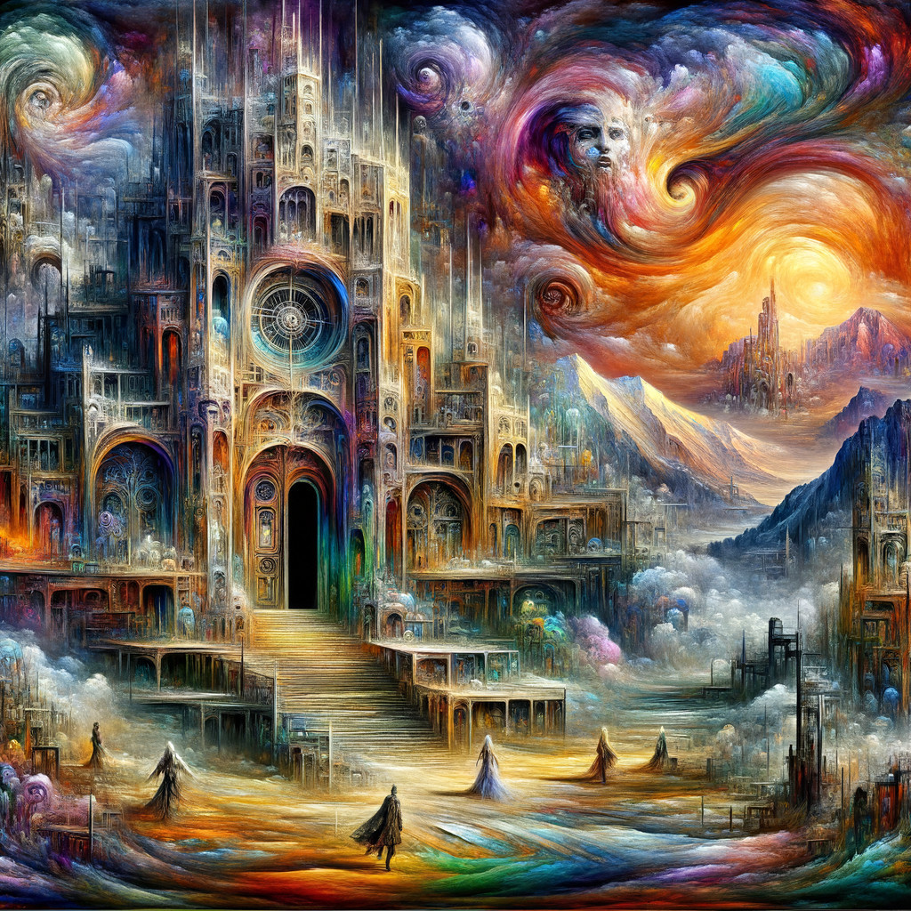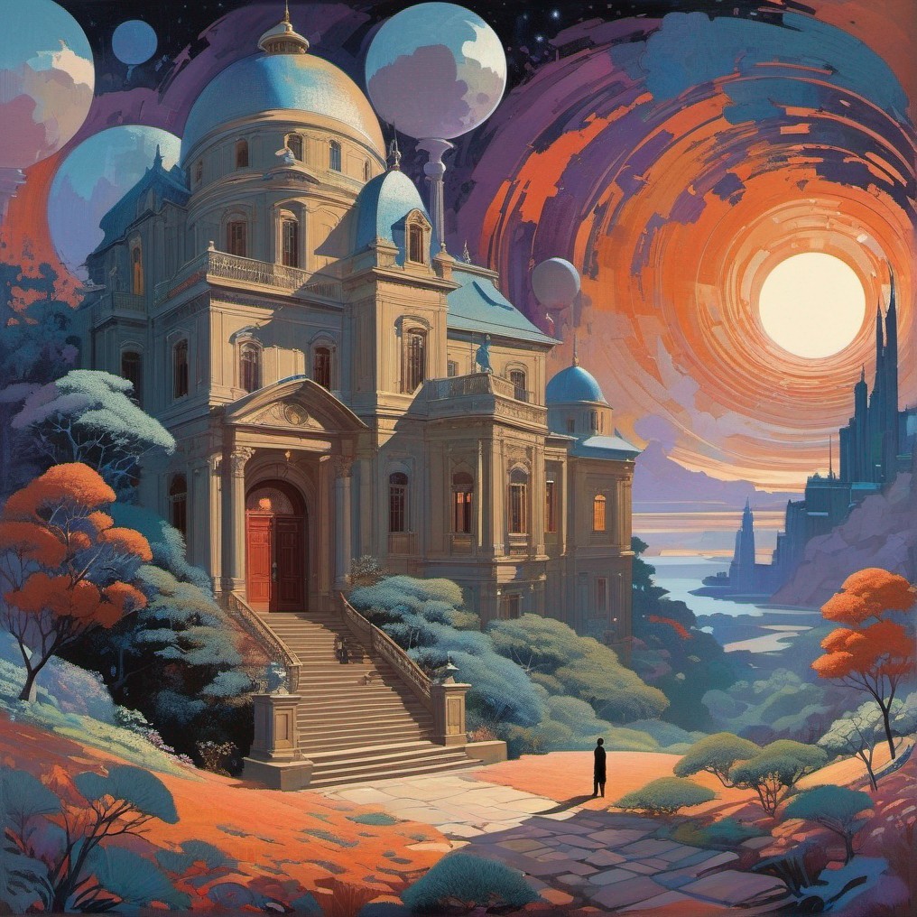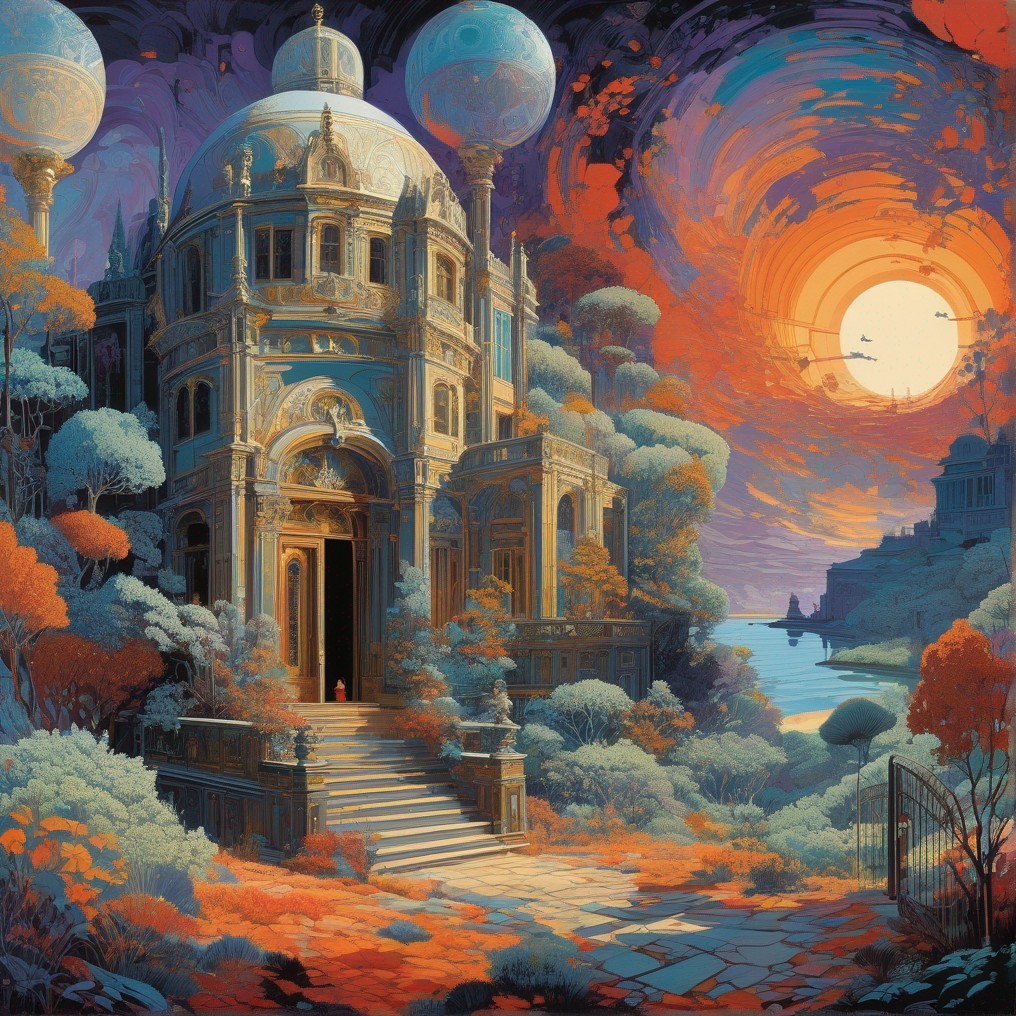 Prompt: "Forbidden Key: Opening the doors of a mystical mansion, the heroes discover terrible secrets. painting style Kilian Eng. A fusion of colors in the sky. The artwork shows crisp high definition quality, intricate details and precision. Audrey Beardsley in collaboration with Dee Nickerson and Alfred Wallis in muted colors. Yossi Kotler an amazing spectacle. Psychosomatic surrealistic, George Callaghan"
