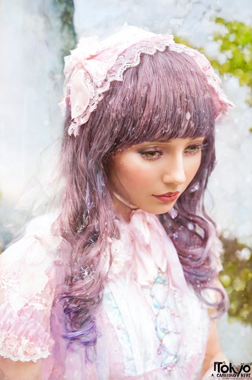 Woman in pastel outfit with flower headpiece and purple hair in pensive pose