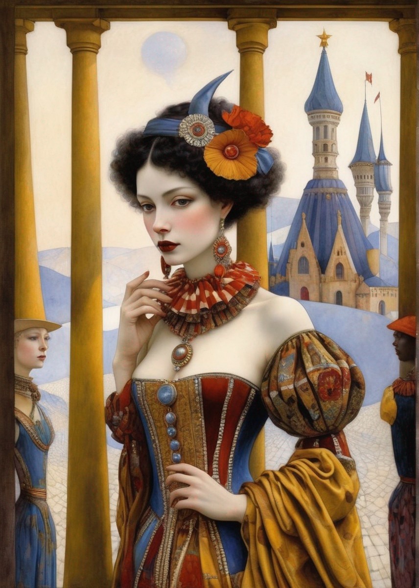 Queen of the clowns. opulence, by Nicoletta Ceccoli, by Kay Nielsen