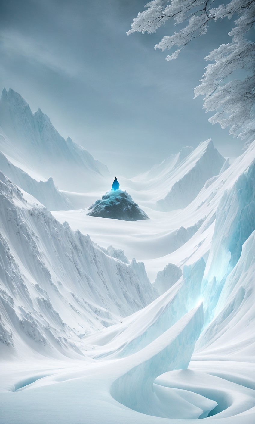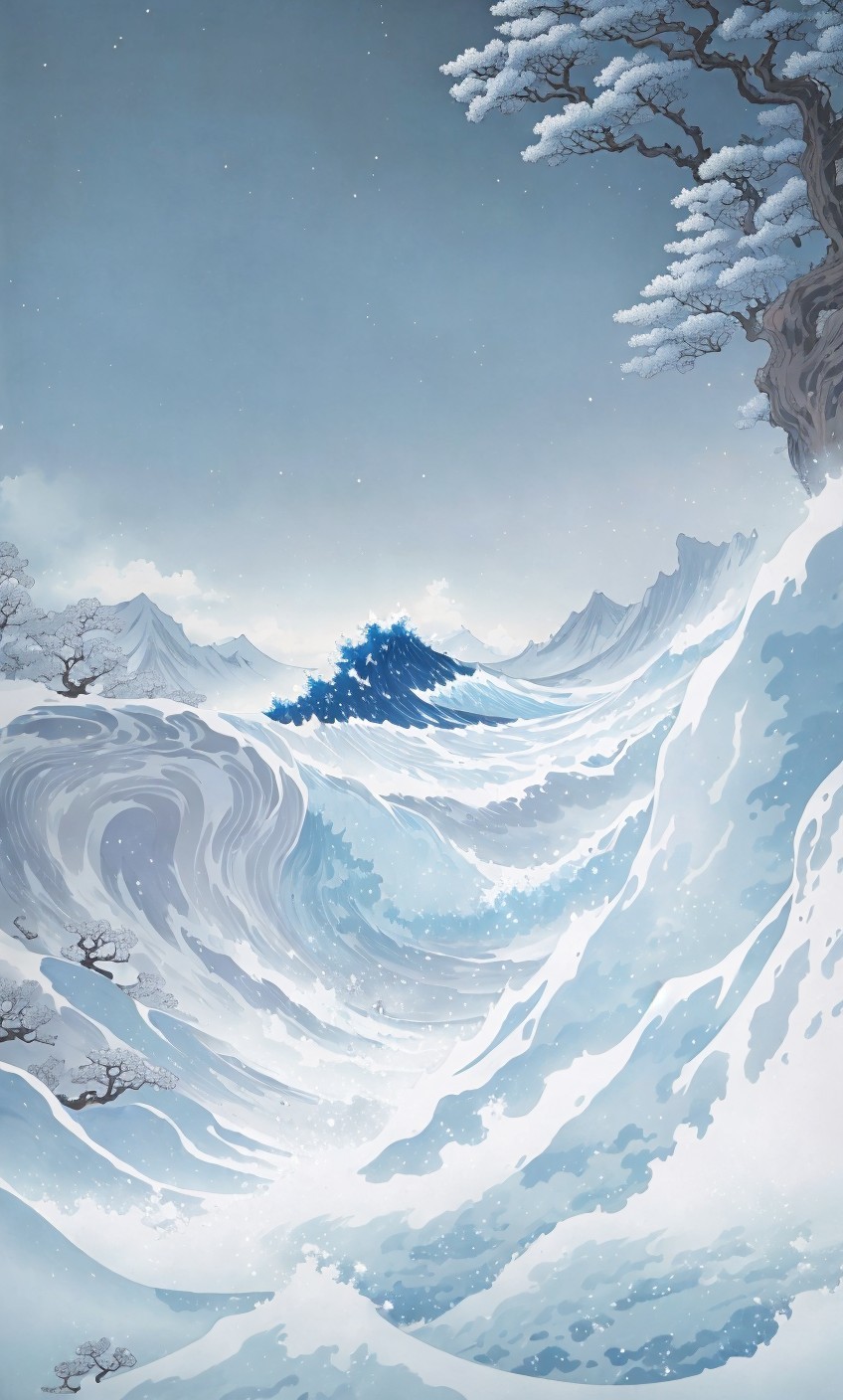 Snow-covered mountains with wave-like shapes under a full moonlit night sky.
