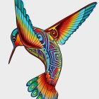 A vibrant, colorful bird with intricate feather patterns stands on a rock, wings extended against a serene backdrop of mountains and mist at sunrise, creating a lively, fantasy atmosphere.