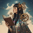 In a surreal setting, a woman with long hair wears a castle-like crown. She holds an open book, surrounded by ornate towers and celestial elements, blending elegance and fantasy.