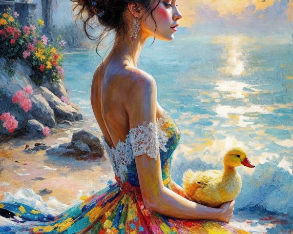 A whimsical clown with colorful hair and antler-like horns playfully holds a red balloon while skipping toward a cute duckling in a vibrant, autumnal landscape filled with flowers.
