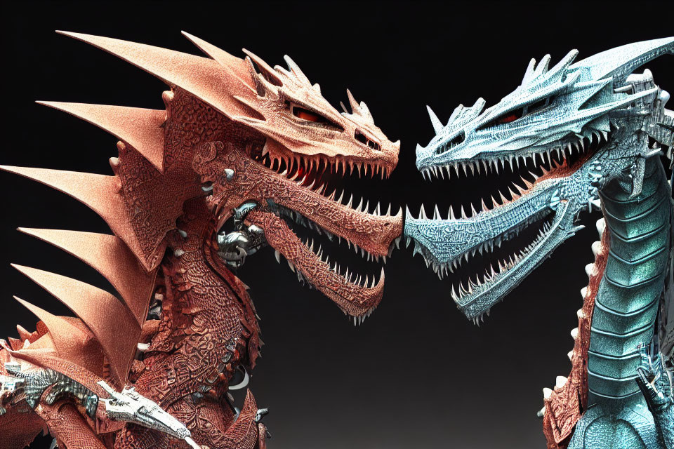 Detailed Mechanical Dragons with Red Eyes Facing Each Other on Dark Background