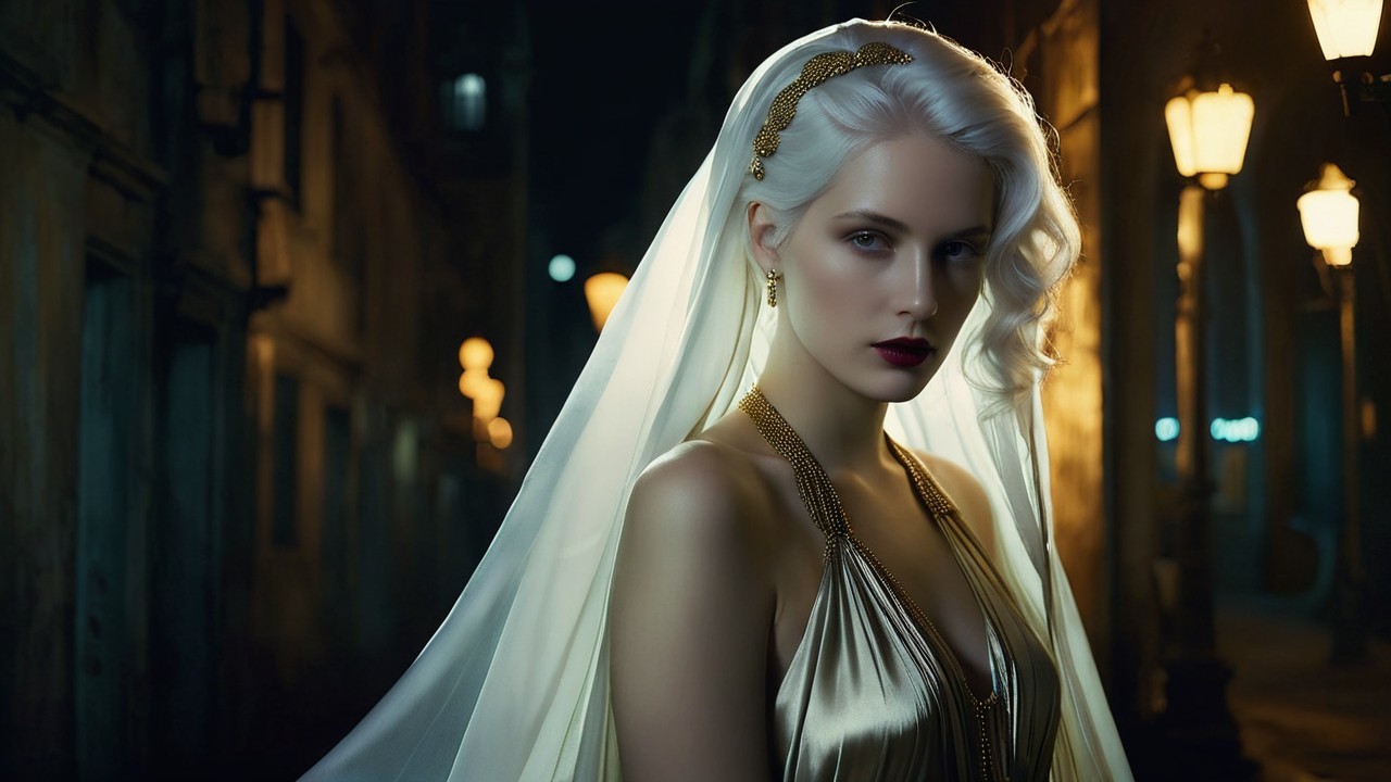 Prompt: "night visit to the city" [Ethereal photography of (white hair) woman in silk, shrouded in eerie ambiance, oxidian hues with golden shadows, historical vintage retro flair, surrealistic vibe, reminiscent of fashion photography by Tim Walker and Sarah Moon, with a touch of cyberpunk aesthetic. delicate features, flowing attire, serene expression, intricate hair ornaments, ancient architecture, lush greenery, blurred background, macro photography, static composition, high definition detail, enchanting ambiance, Ultra-realistic portrayal, sharp focus, cinematic lighting]{Catrin Welz-Stein Stephen Gammell Dee Nickerson, Makoto Yukimura art design Bill Reid, 8k; uncanny; highly detailed and intricate}{surreal splash art, pale translucent skin, hi-res, photorealistic, Nikon Z9, 85mm F1.2, DOF, smooth and realistic HDR}
