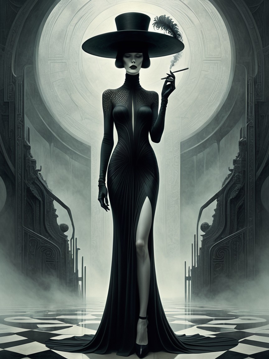 Prompt: "asymetric here look good as hell - a refined woman by Giger and Beksinski standards, clad in a flowing, Art Deco-inspired gown, with a long, curved cigarette holder and a wide, floppy brim hat, stands poised amidst a dreamlike atmosphere, as if lost in thought. Her sleek, geometric form dissolves into bold, expressive brushstrokes, reminiscent of Franz Kline's abstract expressionism and Salvador Dali's surrealist tendencies. The monochromatic palette bleeds and melts, like wax, into sinuous, organic streaks, evoking Jackson Pollock's action paintings. Against a pristine white background, the woman's silhouette appears to be poured, like liquid, into the surrounding space, creating a sense of weightlessness and ethereal elegance, inspired by the styles of Claude Verlinde and Remedios Varo."