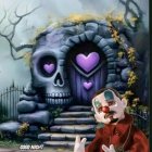 A spooky scene features a sinister clown with exaggerated makeup holding a book, standing near a whimsical door adorned with a grinning skull. The dark setting enhances the eerie atmosphere.