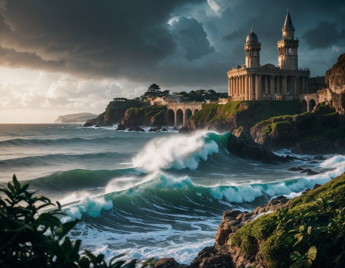 A dramatic coastal scene features a grand, historic building atop rugged cliffs, with towering spires. The turbulent sea crashes against the rocks beneath a stormy sky, creating an intense atmosphere.