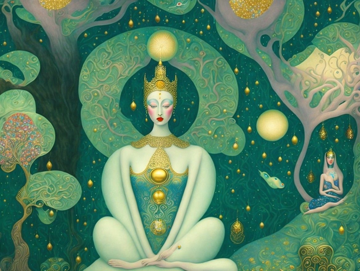 The image features a serene, ethereal figure seated in a lush, dreamlike landscape. Surrounded by vibrant trees and celestial elements, it emanates tranquility and mystical energy.