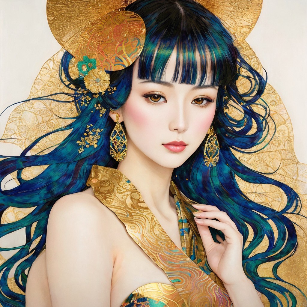 Prompt: "Double exposure,in silk iridescent texture, Klimt paint beautiful Japanese woman, in watercolor and ink imperial colors with gold foil detail, Art Deco by Enki Bilai, Annigoni, Egon Schiele, Milo Manara, Botticelli, Catrin Welz-Stein, Jean Metzinger, Klimt, perfect eyes, perfect handsface, highly detailed, splatter, dynamic pose, dark blue background"
