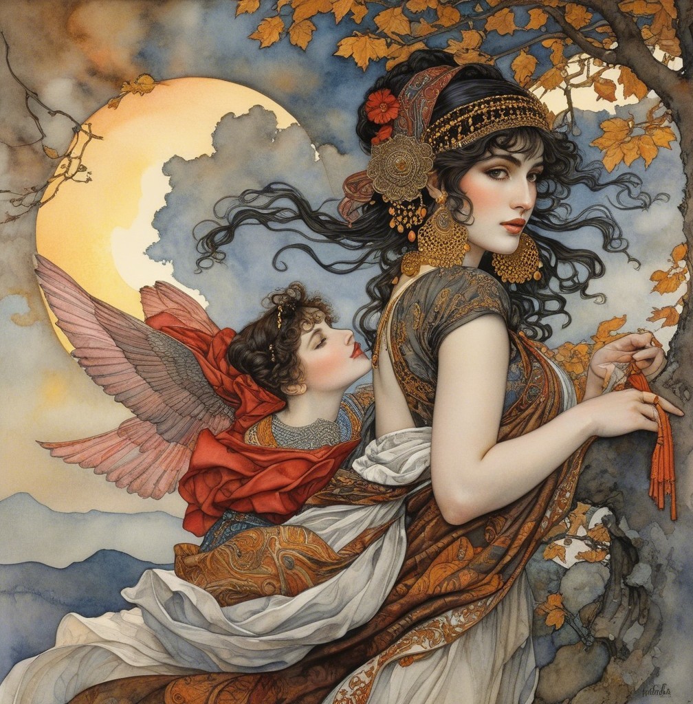 A beautiful woman with flowing dark hair stands against a large moon, dressed in richly patterned garments. Autumn leaves surround her, enhancing the enchanting and serene atmosphere.