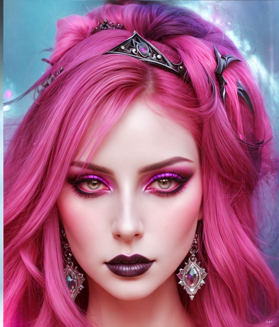 Gothical empress, close up portraiture, girgeous, strict, hazy, vampirical, eerie, occult, dark charcoal sketch, pale colors, saturated colors, dark fantasy style, plasticity 1.6, 3d effects 1.8, dynamic lighting 1.7, colorful reflections, radiance, highly detailed, gothical background, brushed textures, stylized illustration 1.5, tints of 1970s advertising art, charcoal and inkpunk textures, negative-digital, devilish eyes, tints of William Timlin and Margaret Keane, hues, highly chipped background, flares, finest strokes, actiin pose, synthetic, detailed zentangle hairdo in gothical style, triadic color scheme pink blue red, eldritch appearance, octane render illustration, auracore, (dreamscape, mystical symbolism, metallic colors (erotic essence, alcoholic inkpunk 1.8) 8:5), colorful surrounding, chiaroscuro lighting in background, psychedelic psychpomp scene, high coloring 1.9, grain, brightness 1.4 ,Anglocore 1.9, retrofuturistic details, ambient occlusion 1.5, anisotropic filtering 1.7, beautiful composition,  tints of american primitive art, geometrical illustration, tints of Steve Hanks and Margaret Keane, pointillism details,