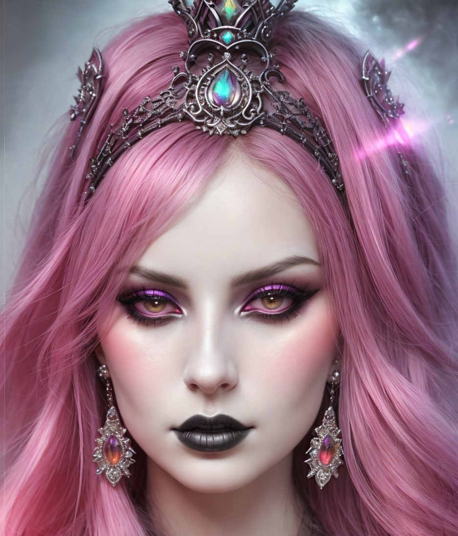 Gothical empress, close up portraiture, gorgeous, strict, hazy, eerie, occult, wet on wet watercolor painting, soft mist pale colors, saturated colors, dark fantasy style, plasticity 1.6, 3d effects 1.8, dynamic lighting 1.7, colorful reflections, radiance, highly detailed, gothical background, brushed textures, stylized illustration 1.5, tints of 1970s advertising art, geometrical, golden ratio, colorful iridescence, magical realism, creamy, marinism, eerie, occult, Anglocore 1.9, fauvistic, fairycore 1.9, fine brushed textures, stylized, metallic colors, intricate ornamental details, plushy psychpomp scene, victorian, gothical, complexion 1.4, raytraced shadows 1.8, 3d illustration, Devilish eyes, feminine, spiritual essence, triadic color scheme pink purple grey, ambient occlusion 1.5, anisotropic filtering 1.7, dynamic lighting 1.7, octane render, brightness 1.4, shadow mapping, art nouveau style, pompous, lavish, moody, maximalism, radiance, highly detailed ornamental features