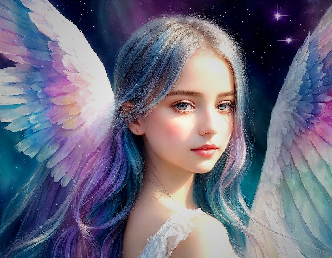 In the frame of a dreamlike watercolor painting, of a little angel The image captures her ethereal essence with vibrant brushstrokes, as she is depicted with flowing hair cascading in shades of gentle pastels. The delicate translucence of her wings glimmers with a soft iridescence, complementing her captivatingly enchanting gaze. This exquisite artwork transports the viewer into a whimsical realm, where the nymph's mystic charisma radiates from the canvas in a captivating