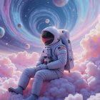 An astronaut sits peacefully among colorful clouds, gazing at a vibrant galaxy filled with swirling stars and planets, reflecting the cosmos within their helmet. A scene of wonder and tranquility.