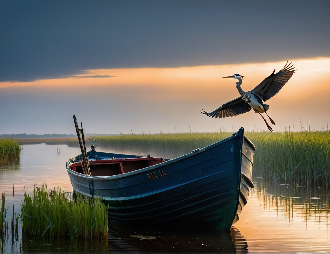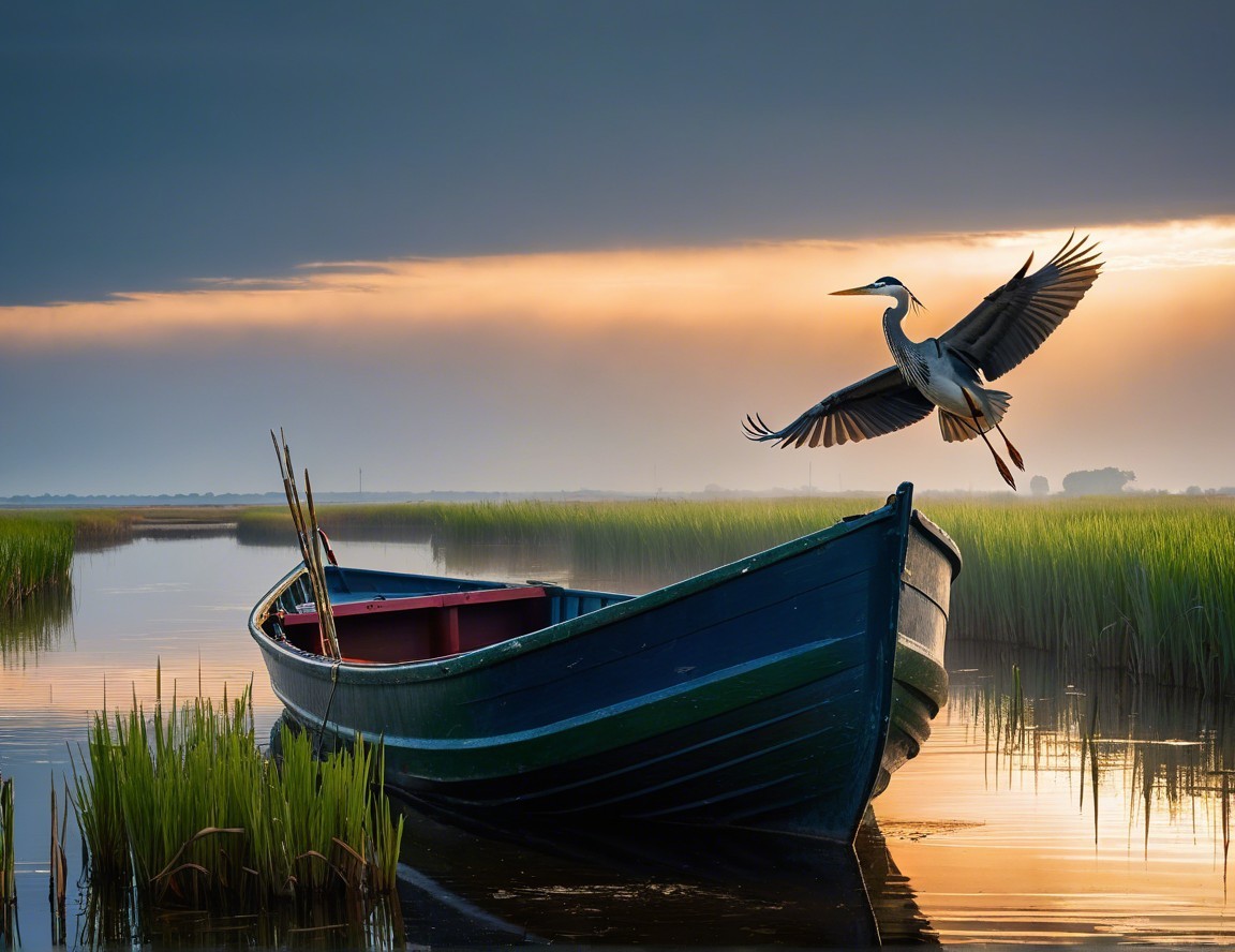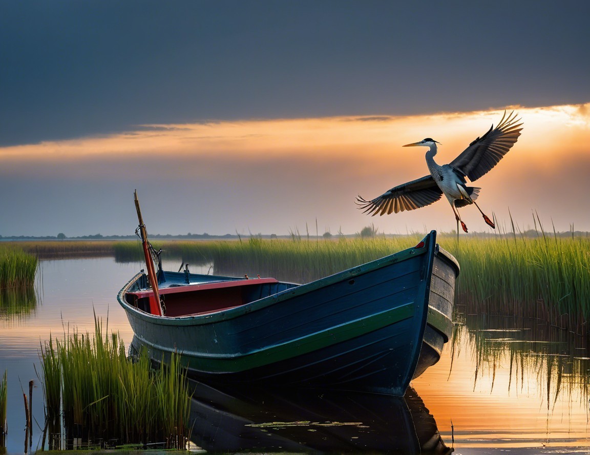 Description : A tranquil lake scene at sunset with a boat and a bird in flight against an orange-tinged sky and green reeds.